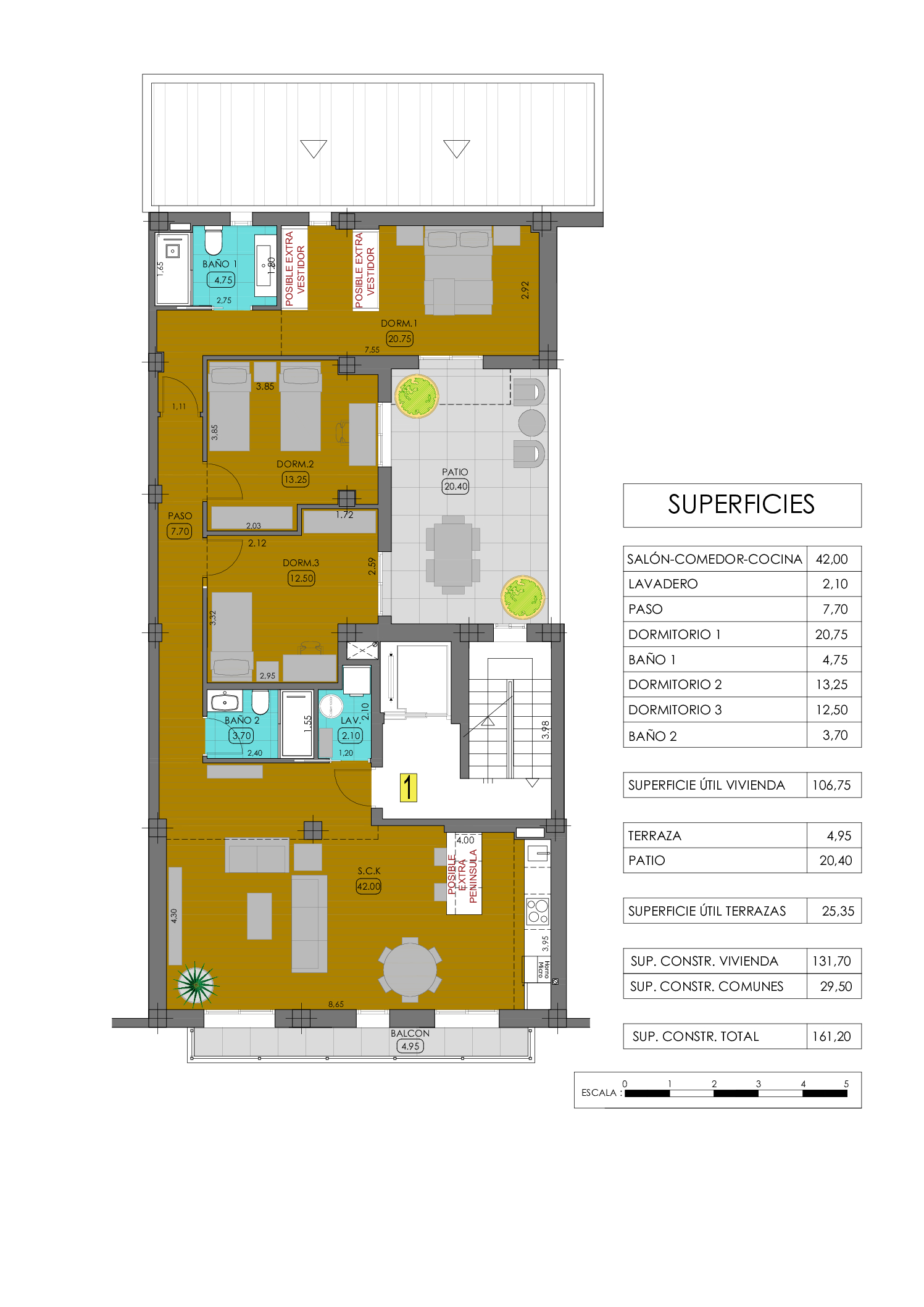 Plano primera planta, dispone de terraza y posibilidad de isla en cocina y vestidor en dormitorio principal, precio de los extras a consultar.