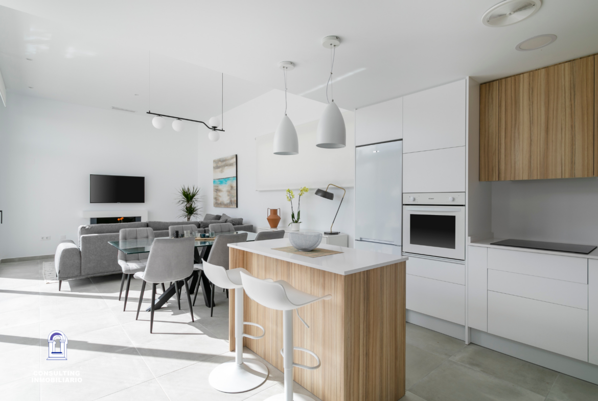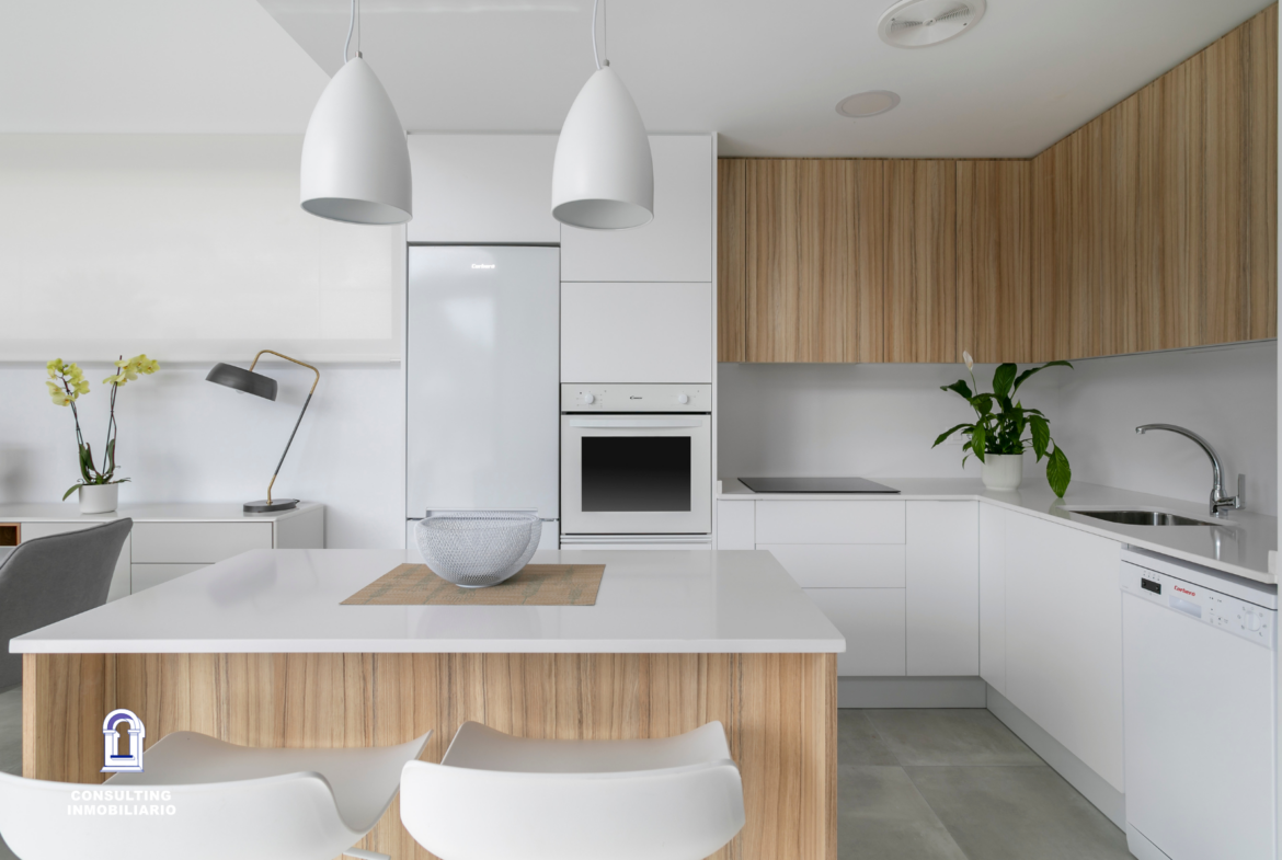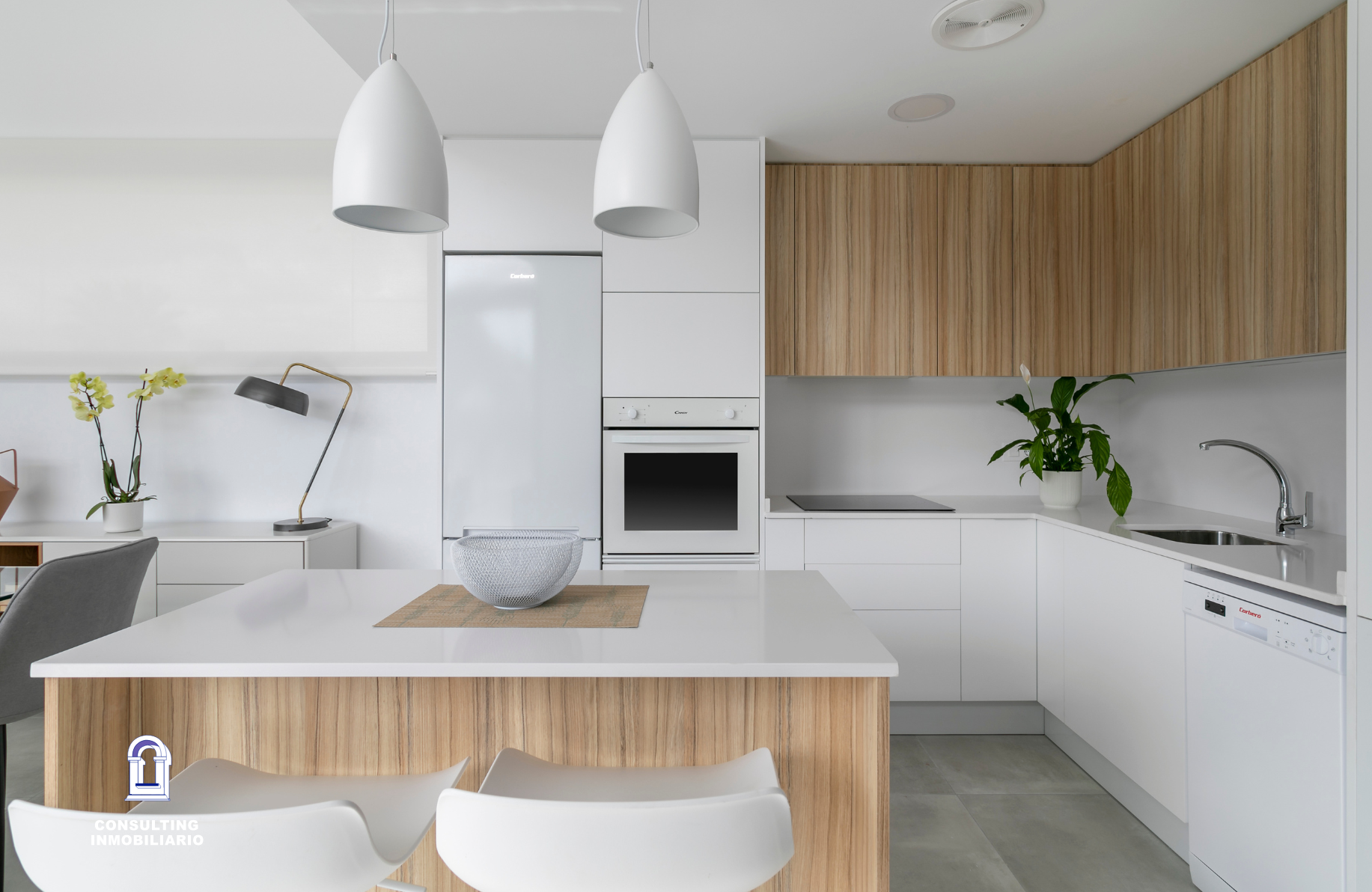 - Cocina amueblada con encimera y frontal de Silestone, equipada con electrodomésticos (horno, vitrocerámica, campana extractora y lavavajillas)