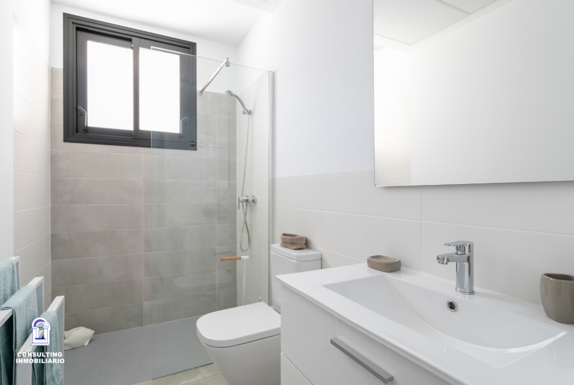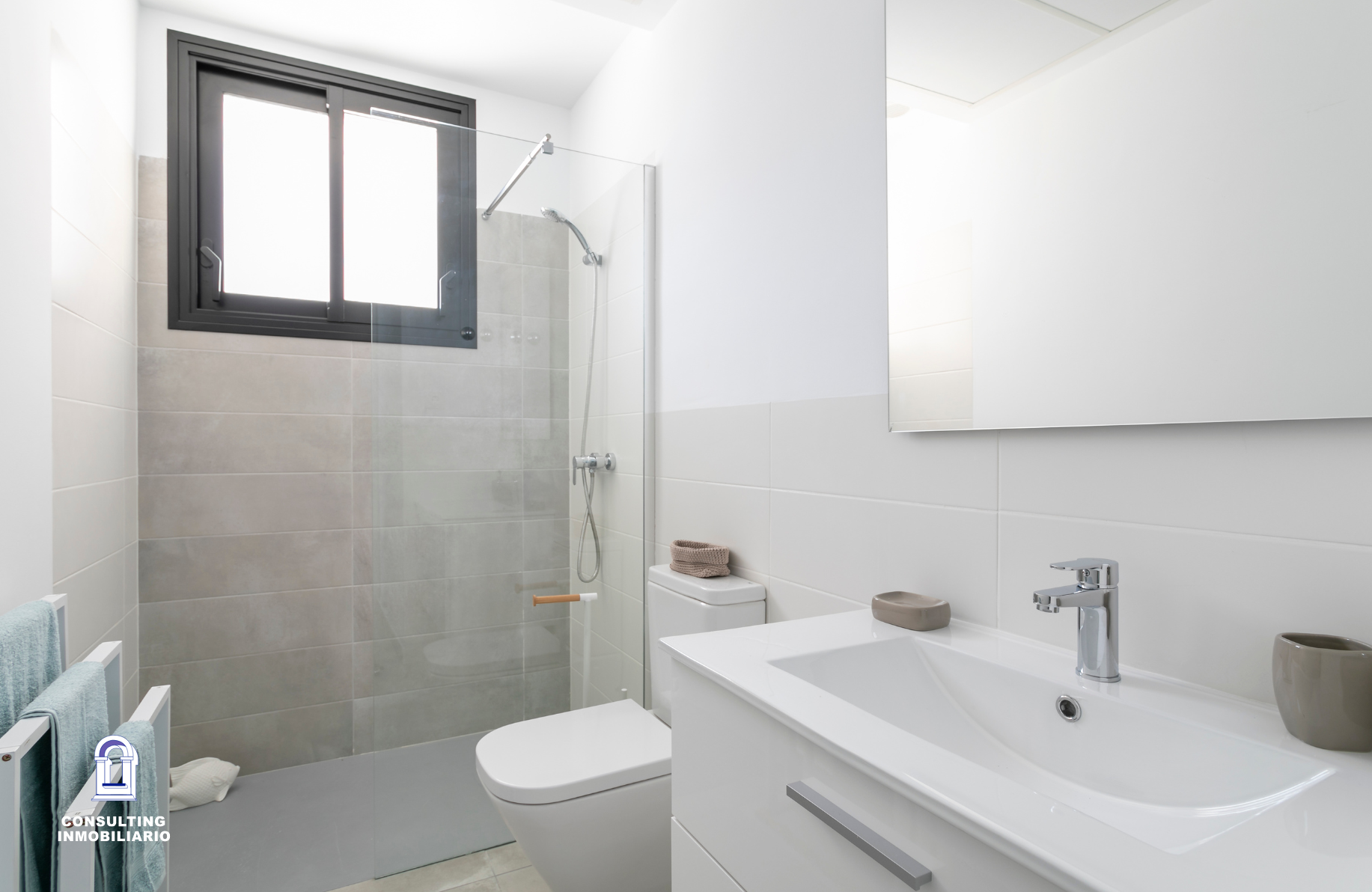 - Baños con aparatos sanitarios, espejo LED y mampara fija